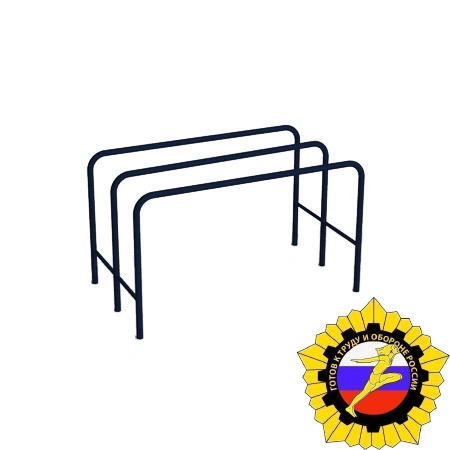 Брусья выполнены из круглой металлической трубы, расположены параллельно и симметрично изогнуты под углом 90 градусов. Расстояние между внутренними поверхностями поручней по 510 мм. Рабочая поверхность поручней 1 800 мм. Высота поручней 1 100 мм от поверхности основания. Тренажер отвечает всем требованиям по сдаче норм ГТО!