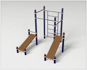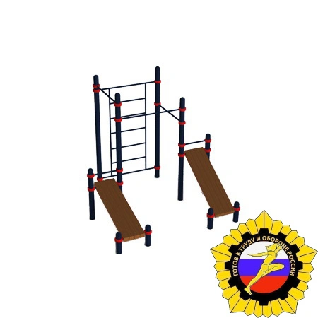 Комплекс состоит из восьми опорных столбов, изготовленных из металлических труб, высотой от 400 мм до 2 600 мм. Столбы сверху закрыты металлическими полусферами. В комплексе к столбам высотой 600 мм при помощи металлических хомутов, крепится шведская стенка, шагом перекладин 300 мм, шириной 1 200 мм, высотой 2200 мм. Между столбами высотой 2 600 мм при помощи металлических хомутов, фиксируются три перекладины длиной 1 200 мм. В комплексе присутствуют две скамьи для пресса. Вертикальная и под углом 35 градусов. Платформа скамьи для пресса изготовлена из брусков сосновой породы, обработанных антисептическими средствами для защиты древесины. Тренажер отвечает всем требованиям по сдаче норм ГТО!