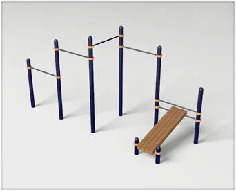 Комплекс состоит из восьми опорных вертикальных столбов, изготовленных из металлических труб, высотой от 400 мм до 2 600 мм. Горизонтальные перекладины шириной 1 200 мм фиксируются при помощи металлических хомутов на различной высоте по согласованию с заказчиком. Скамья для пресса фиксируется к столбам высотой 400 мм на высоте 200 мм от поверхности основания. Платформа скамьи для пресса изготовлена из брусков сосновой породы, обработанных антисептическими средствами для защиты древесины. Тренажер отвечает всем требованиям по сдаче норм ГТО!