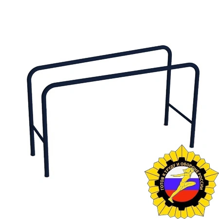 Брусья выполнены из круглой металлической трубы, расположены параллельно и симметрично изогнуты под углом 90 градусов. Расстояние между внутренними поверхностями поручней 510 мм. Рабочая поверхность поручней 1 800 мм. Высота поручней 1 100 мм от поверхности основания. Тренажер отвечает всем требованиям по сдаче норм ГТО!