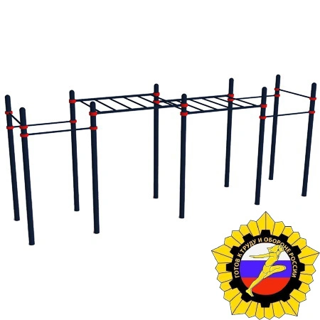 Комплекс состоит из десяти опорных вертикальных столбов, изготовленных из металлических труб. Высота каждого столба 2 600 мм. Столбы сверху закрыты металлическими полусферами. В комплексе присутствуют шесть перекладин для подтягивания длиной 1 200 мм. Горизонтальные перекладины фиксируются при помощи металлических хомутов. Рукоход состоит из двух секций длиной 1 800 мм. Конструкция рукохода фиксируются на высоте 2 400 мм и 2 250 мм. Шаг перекладин рукохода 330 мм. Диаметр перекладин 34 мм. Тренажер отвечает всем требованиям по сдаче норм ГТО!