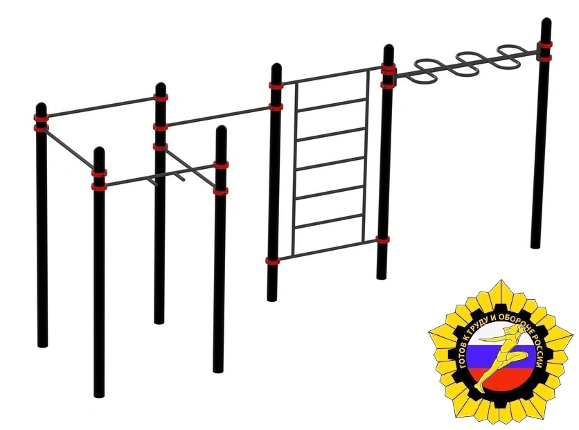 Комплекс состоит из семи вертикальных столбов, изготовленных из металлических труб высотой 2 600 мм. Столбы сверху закрыты металлическими полусферами. Спортивный комплекс для занятий воркаутом, включает в себя четыре перекладины для подтягивания длинной 1 200 мм, и одну перекладину «молоток» для неклассического подтягивания. В комплексе присутствует шведская стенка с расстоянием между перекладинами 300 мм. Рукоход-змейка, длиной 1 800 мм расположен в комплексе на высоте 2 200 мм и зафиксирован металлическими хомутами к двум вертикальным столбам. Шаг перекладин рукохода 300 мм. Тренажер отвечает всем требованиям по сдаче норм ГТО!!