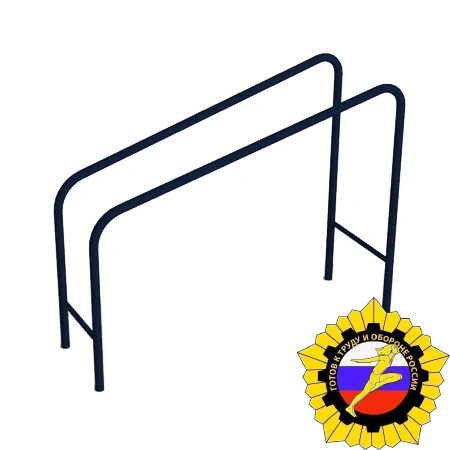 Брусья выполнены из круглой металлической трубы, расположены под уклоном. Расстояние между внутренними поверхностями поручней по 510 мм. Рабочая поверхность поручней 1 800 мм. Высота поручней 1 500 мм от поверхности основания. Тренажер отвечает всем требованиям по сдаче норм ГТО!