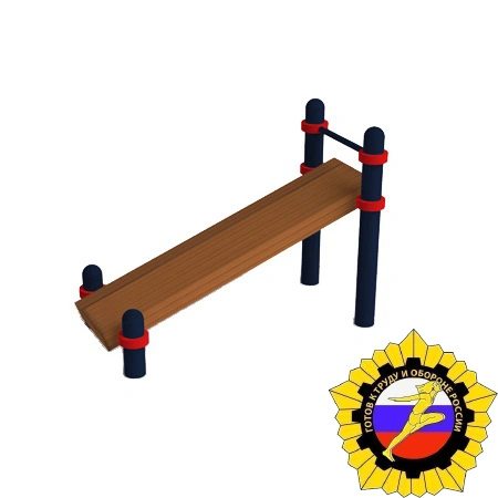 Платформа скамьи для пресса изготовлена из брусков сосновой породы, обработанных антисептическими средствами для защиты древесины и зафиксирована при помощи хомутов к вертикальным опорным столбам под уклоном. Длина 1 600 мм, ширина 800 мм, высота 1 500 мм. Тренажер отвечает всем требованиям по сдаче норм ГТО!