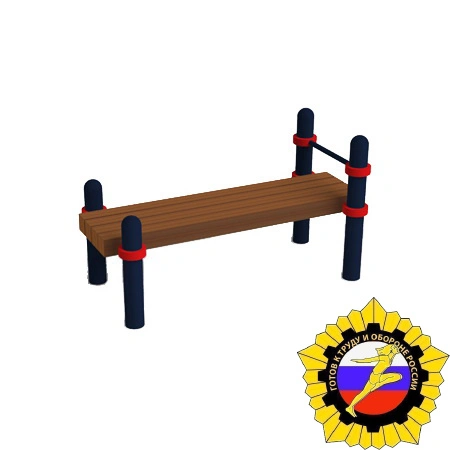 Платформа скамьи для пресса изготовлена из брусков сосновой породы, обработанных антисептическими средствами для защиты древесины и зафиксирована при помощи хомутов к вертикальным опорным столбам. Длина 1 600 мм, ширина 800 мм, высота 1 000 мм. Тренажер отвечает всем требованиям по сдаче норм ГТО!