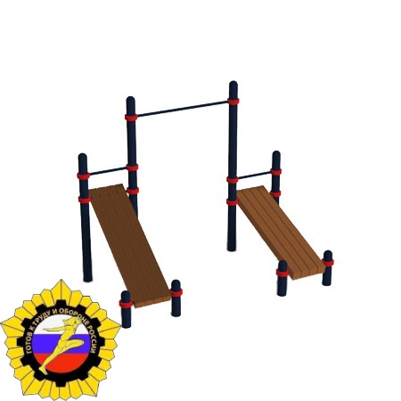 Спортивный снаряд состоит из двух вертикальных столбов, изготовленных из металлических труб, высотой 2 600 мм и одна перекладина для подтягивания, расположенная на высоте 2 200 мм и 2 000 мм от поверхности основания. Столбы сверху закрыты металлическими полусферами. Крепление перекладин для подтягивания, осуществляется при помощи металлических хомутов. Длина каждой перекладины 1 200 мм. Скамья для пресса фиксируется под уклоном к столбам высотой 400 мм, на высоте 200 мм от поверхности основания. Платформа скамьи для пресса изготовлена из брусков сосновой породы, обработанных антисептическими средствами для защиты древесины. Тренажер отвечает всем требованиям по сдаче норм ГТО!