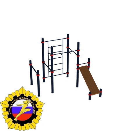 Комплекс состоит из девяти опорных столбов высотой 2 600 мм – 4 шт., 500 мм – 2 шт, 1 500 мм - 3 шт. В комплексе к столбам высотой 2 600 мм при помощи хомутов крепится шведская стенка с шагом перекладин 340 мм, шириной 1 200 мм, высотой 2 200 мм. Перекладины длиной 1 200 мм (для подтягивания) фиксируются при помощи хомутов между столбами 2 600 мм на высоте 2 200 мм, 2 000 мм, 1 500 мм. В комплексе присутствует лавка для упражнений на пресс под углом которая фиксируются к опорным столбам при помощи хомутов и перекладин длиной 500 мм. Перекладины крепятся при помощи хомутов к опорным столбам высотой 2 600 мм. Тренажер отвечает всем требованиям по сдаче норм ГТО!