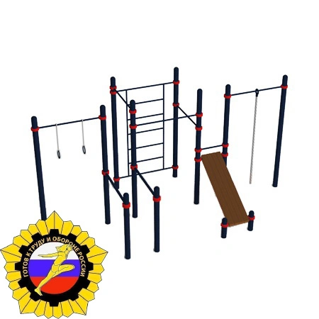 Комплекс состоит из двенадцати опорных столбов высотой 2 600 мм – 8 шт., 500 мм – 2 шт, 1500 мм – 2 шт. В комплексе к столбам высотой 2 600 мм при помощи хомутов крепится шведская стенка с шагом перекладин 340 мм, шириной 1 200 мм, высотой 2 200 мм. Три перекладины длиной 1 200 мм (для подтягивания) фиксируются при помощи хомутов между столбами 2 600 мм на высоте 2 200 мм, 2 000 мм, 1 800 мм. В комплексе присутствует лавка для упражнений на пресс под углом, которая фиксируются к опорным столбам 2 600 мм и 500 мм при помощи хомутов и перекладин длиной 500 мм. В комплексе расположен канат и кольца. Перекладины крепятся при помощи хомутов к опорным столбам высотой 2 600 мм. Тренажер отвечает всем требованиям по сдаче норм ГТО!