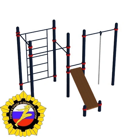 Комплекс состоит из восьми опорных столбов высотой 2 600 мм – 6 шт., 500 мм – 2 шт. В комплексе к столбам высотой 2 600 мм при помощи хомутов крепится шведская стенка с шагом перекладин 340 мм, шириной 1 200 мм, высотой 2 200 мм. Три перекладины длиной 1 200 мм (для подтягивания) фиксируются при помощи хомутов между столбами 2 600 мм на высоте 2 200 мм, 2 000 мм, 1 800 мм. В комплексе присутствует лавка для упражнений на пресс под углом которая фиксируются к опорным столбам 2 600 мм и 500 мм при помощи хомутов и перекладин длиной 500 мм. В комплексе расположен канат. Тренажер отвечает всем требованиям по сдаче норм ГТО!