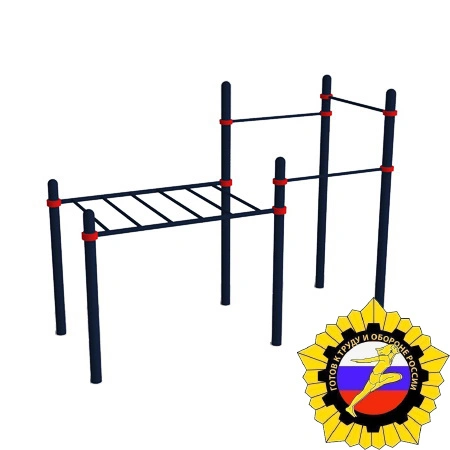Комплекс состоит из шести опорных вертикальных столбов, изготовленных из металлических труб высотой 2 600 мм - 3 шт, 2 000 мм – 1 шт, 1 500 мм – 2 шт. Столбы сверху закрыты металлическими полусферами. В комплексе присутствуют три перекладины для подтягивания длиной 1 200 мм. Горизонтальные перекладины фиксируются при помощи металлических хомутов. Рукоход состоит из одной секции длиной 1 800 мм. Конструкция рукохода фиксируются на высоте 1 500 мм. Шаг перекладин рукохода 330 мм. Диаметр перекладин 34 мм. Тренажер отвечает всем требованиям по сдаче норм ГТО!