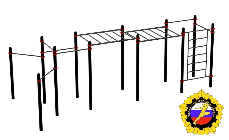 Комплекс состоит из двенадцати опорных вертикальных столбов, изготовленных из металлических труб. Высота каждого столба 2 600 мм. Столбы сверху закрыты металлическими полусферами. В комплексе присутствуют семь перекладин для подтягивания длиной 1 200 мм. Горизонтальные перекладины фиксируются при помощи металлических хомутов. Рукоход состоит из двух секций длиной 1 800 мм. Конструкция рукохода фиксируются на высоте 2 400 мм и 2 250 мм. Шаг перекладин рукохода 330 мм. Диаметр перекладин 34мм высотой 2 000 мм. В комплексе к столбам высотой 2 600 мм при помощи хомутов крепится шведская стенка с шагом перекладин 340 мм, шириной 1 200 мм. Тренажер отвечает всем требованиям по сдаче норм ГТО!