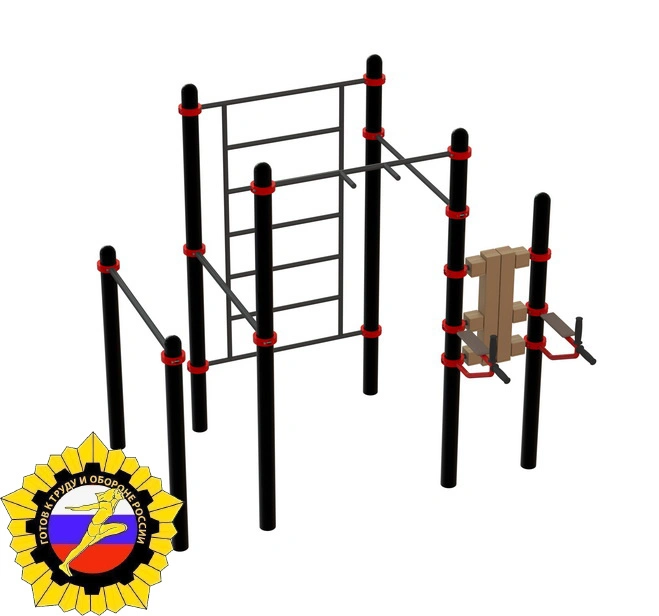 Комплекс состоит из шведской стенки, брусьев для отжимания, перекладин для подтягиваний (в том числе с узким хватом), тренажера «Брусья - пресс». Перекладины для подтягиваний установлены на высоте 2 400 мм и 2 200 мм, брусья для отжиманий расположены на высоте 1 100 мм, тренажер «Брусья - пресс» устанавливается на высоте 1 100-1 200 мм от поверхности земли до рукояток его брусьев. Крепеж всех элементов к опорным столбам осуществляется при помощи металлических хомутов. Длина каждой перекладины 1 200 мм. Высота шведской стенки 2 200 мм, шаг перекладин 350 мм, ширина стенки 1 200 мм. Высота столбов от 1 550 мм до 2 600 мм. Тренажер отвечает всем требованиям по сдаче норм ГТО!
