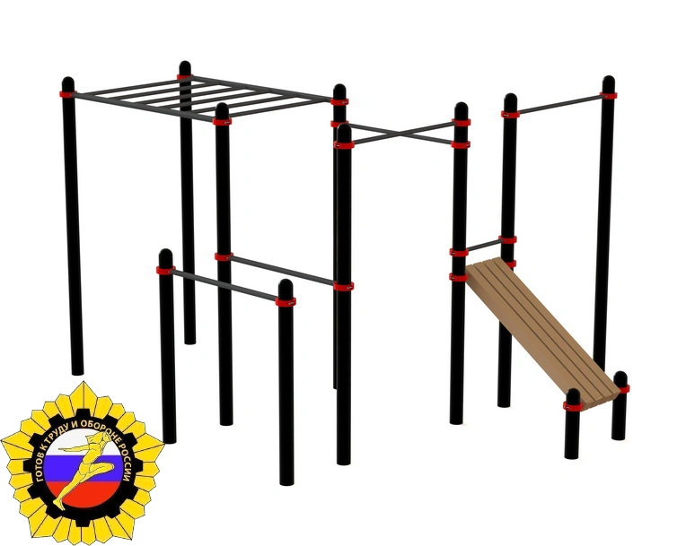 Комплекс состоит из рукохода, брусьев для отжимания, трех перекладин для подтягиваний, наклонной лавки для пресса. Перекладины для подтягиваний установлены на высоте 2 000 мм и 2 400 мм от поверхности земли, брусья для отжиманий устанавливаются на высоте 1 100 мм, наклонная скамья после монтажа имеет постоянный угол наклона. Крепеж всех элементов к опорным столбам осуществляется при помощи металлических хомутов. Длина каждой перекладины 1 200 мм. длина рукохода 1 800 мм, шаг перекладин 330 мм, ширина 1 200 мм. Высота столбов от 550 мм до 2 600 мм. Тренажер отвечает всем требованиям по сдаче норм ГТО!