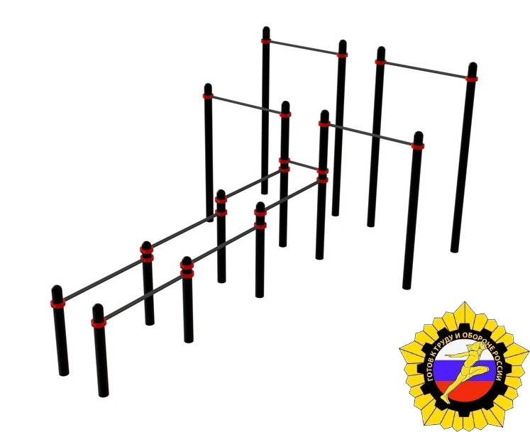 Комплекс состоит из четырех турников, попарно расположенных на разновысотных столбах и трех совмещенных пролетов брусьев для отжимания. Длина каждого пролета брусьев 1 200 мм. Первая пара турников устанавливается на высоте 2 000 мм., вторая пара – 2 500 мм , брусья для отжиманий рекомендуется устанавливать на высоте 900 мм, 1 050 мм и 1 200 мм. Длина каждого турника 1 200 мм., длина поручня брусьев 1 200 мм. Высота столбов от 1 000 мм до 2 600 мм. Тренажер отвечает всем требованиям по сдаче норм ГТО!