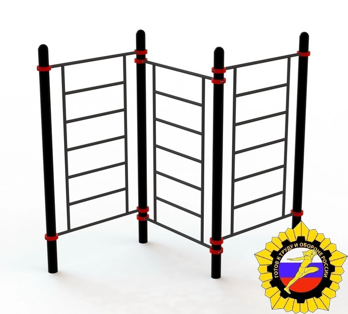 Комплекс состоит из трех шведских стенок расположенных под 90 градусов друг к другу. Высота опорных столбов 2 600 мм. Шведская стенка высотой 2 200 мм фиксируется к опорным столбам при помощи металлических хомутов. Шаг перекладин шведской стенки 350 мм. Ширина стенки 1 200 мм. Тренажер отвечает всем требованиям по сдаче норм ГТО!
