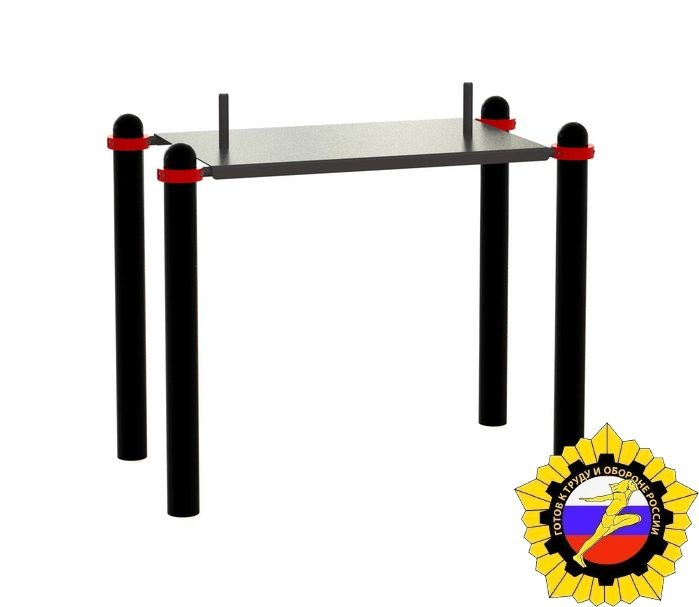 Стол состоит из четырех опорных столбов и металлической столешницы с рукоятками. Края Столешницы подогнуты для обеспечения травмобезопасности. Крепление металлического столба производится стандартными хомутами «Воркаут». Высота столбов 1 200 мм.