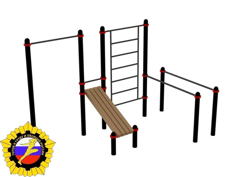 Комплекс состоит из брусьев для отжимания, одной перекладины для подтягивания, шведской стенки и наклонной лавки для пресса. Перекладина для подтягиваний устанавливается на высоте 2 400 мм, брусья для отжиманий устанавливаются на высоте 1 200 мм, наклонная скамья после монтажа имеет постоянный угол наклона. Крепеж всех элементов к опорным столбам осуществляется при помощи металлических хомутов. Длина перекладины для подтягиваний 1 200 мм., длина поручней брусьев 1 800 мм. Шаг перекладин шведской стенки 350 мм. Ширина стенки 1 200 мм. Высота столбов от 500 мм до 2 600 мм.подтягиваний 1 200 мм., длина поручней брусьев 1 800 мм. Высота опорных столбов от 500 мм до 2 600 мм. Тренажер отвечает всем требованиям по сдаче норм ГТО!