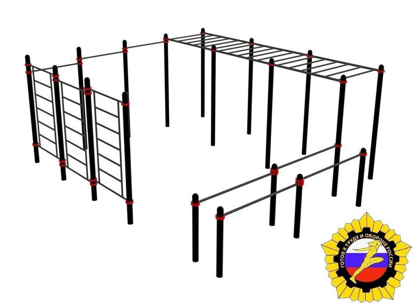 Комплекс состоит из сдвоенных брусьев для отжимания, общей длиной 3 900 мм., трех перекладин для подтягиваний, трех шведских стенок и трех рукоходов. Перекладины для подтягиваний устанавливаются на высоте 2 200 мм и 2 400 мм, брусья для отжиманий устанавливаются на высоте 1 200 мм, рукоходы имеют общие хомуты крепления, что позволяет закрепить их строго на одинаковой высоте 2 400 мм. Крепеж всех элементов к опорным столбам осуществляется при помощи металлических хомутов. Длина перекладин для подтягиваний 1 200 мм., длина поручней брусьев 1 800 мм. Шаг перекладин шведской стенки 350 мм. ширина стенки 1 200 мм., длина одной секции рукохода 1 800 мм, шаг перекладин 330 мм, ширина 1 200 мм. Высота столбов от 1 300 мм до 2 600 мм. Тренажер отвечает всем требованиям по сдаче норм ГТО!