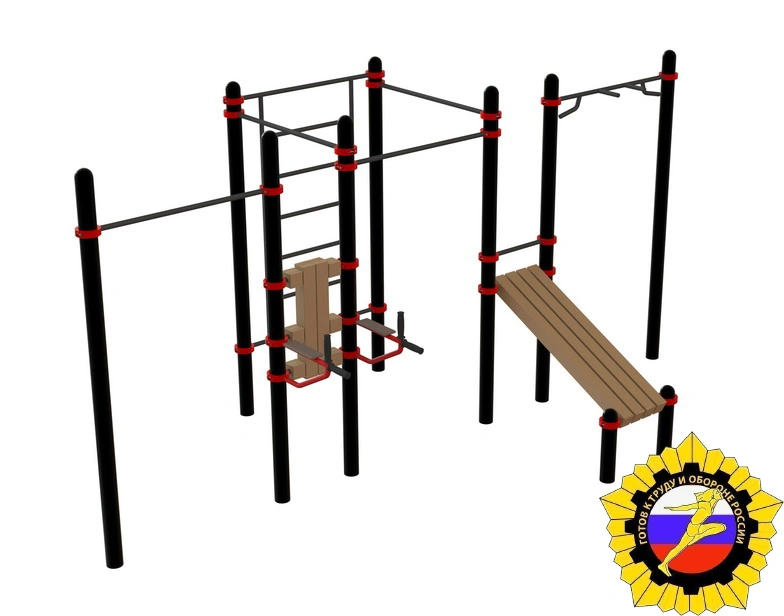 Комплекс состоит из четырех перекладин для подтягивания, одной перекладины с узким обратным хватом + широкий хват, шведской стенки, наклонной лавки для пресса и тренажера «Брусья - пресс». Перекладины для подтягиваний устанавливаются на высоте 2 200 мм, 2 300 мм и 2 400 мм, наклонная скамья после монтажа имеет постоянный угол наклона. «Брусья - пресс» устанавливается на высоте 1 100 – 1 200 мм от поверхности земли до рукояток его брусьев. На тренажере «Брусья - пресс» установлены резиновые рукоятки. Крепеж всех элементов к опорным столбам осуществляется при помощи металлических хомутов. Длина перекладины для подтягиваний 1 200 мм., шаг перекладин шведской стенки 350 мм. Ширина стенки 1 200 мм. Высота столбов от 500 мм до 2 600 мм. Тренажер отвечает всем требованиям по сдаче норм ГТО!