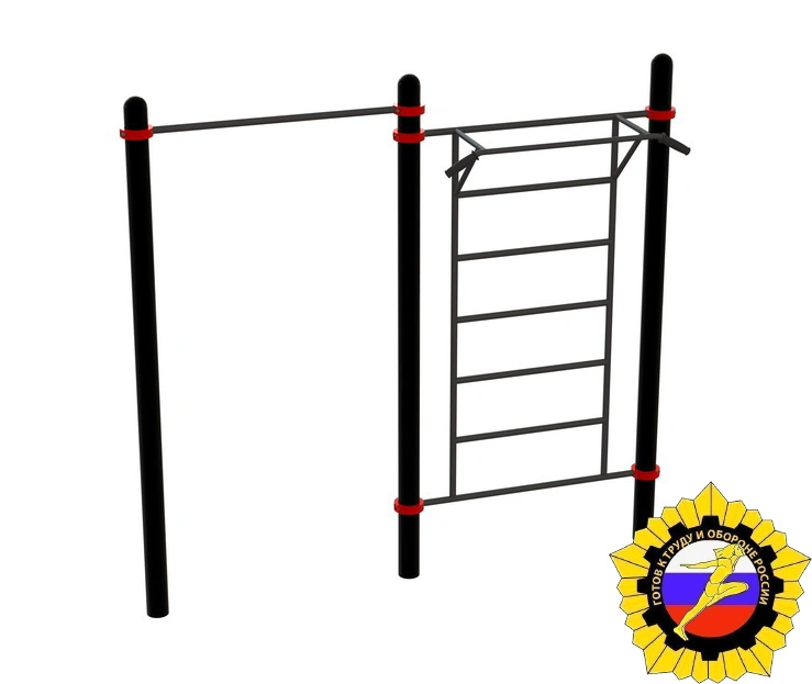 Комплекс состоит из одного турника для подтягиваний, шведской стенки с фиксированным турником для широкого хвата и трех опорных столбов. Перекладина для подтягиваний устанавливается на высоте 2 400 мм. На турнике для широкого хвата устанавливаются резиновые рукоятки. Высота столбов 2 600 мм. Шведская стенка высотой 2 200 мм фиксируется к опорным столбам при помощи металлических хомутов. Шаг перекладин шведской стенки 350 мм. Ширина стенки 1 200 мм. Тренажер отвечает всем требованиям по сдаче норм ГТО!