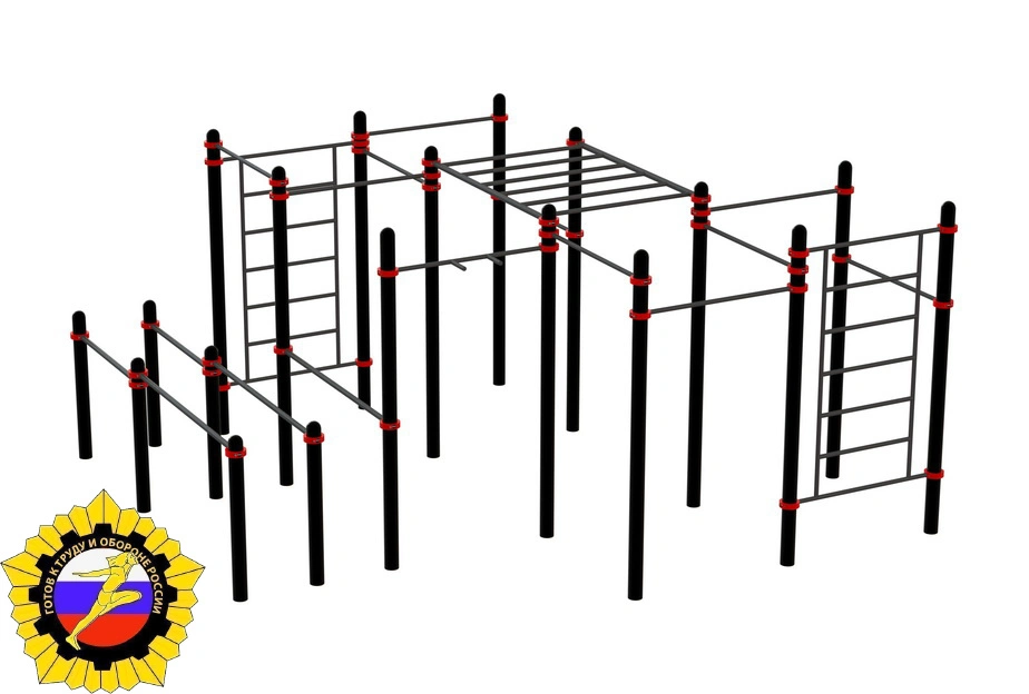 Комплекс состоит из сдвоенных брусьев для отжиманий, общей длиной 3 900 мм., десяти перекладин для подтягиваний, одной перекладины с узким обратным хватом, двух шведских стенок и одного рукохода. Перекладины для подтягиваний устанавливаются на высоте 1 500 мм, 1 700 мм, 1 900 мм, 2 200 мм и 2 400 мм, брусья для отжиманий устанавливаются на высоте 1 200 мм. Крепеж всех элементов к опорным столбам осуществляется при помощи металлических хомутов. Длина перекладин для отжиманий 1 200 мм., длина поручней брусьев 1 800 мм. Шаг перекладин шведской стенки 350 мм. ширина стенки 1 200 мм., длина рукохода 1 800 мм, шаг перекладин 330 мм, ширина 1 200 мм. Высота столбов от 1 500 мм до 2 600 мм. Тренажер отвечает всем требованиям по сдаче норм ГТО!