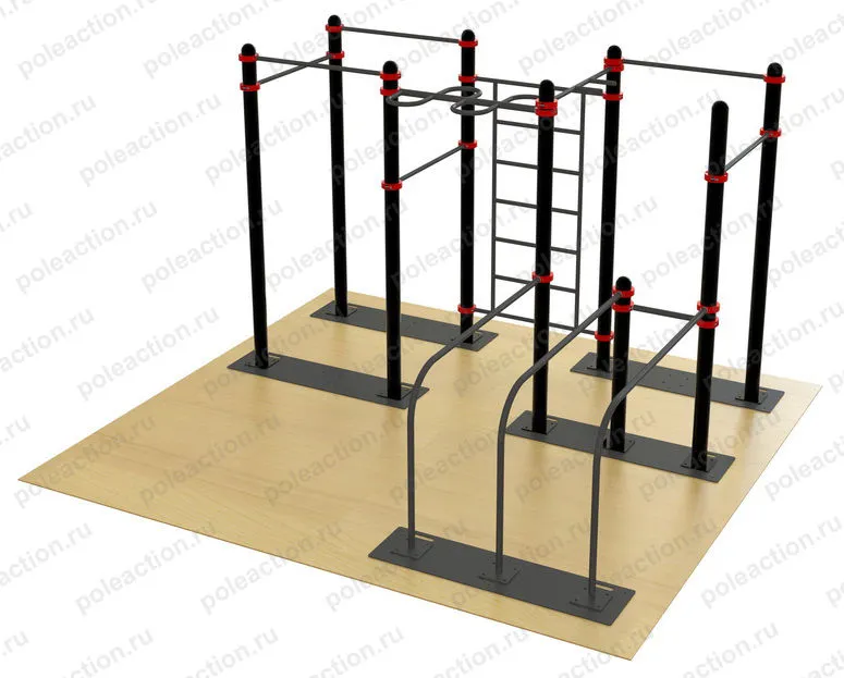 Спортивный комплекс представляет собой сборную металлическую конструкцию состоящую из девяти опорных столбов с площадками для крепления к пластинам основания и полусферическими заглушками, шести перекладин длиной L=1090 мм., одной перекладины длиной L=1090 мм с возможностью с возможностью выполнять упражнения «узким хватом», рукохода «змейка», брусьев для отжиманий и шведской стенки. Для большей жесткости опорные столбы брусьев усилены дополнительным поручнем длиной L=490 мм. Крепление элементов спортивного комплекса осуществляется хомутами, что позволяет легко и быстро фиксировать их на нужной высоте, а опорных столбов к пластинам основания болтами с полусферической головкой. Разборная конструкция спортивного комплекса имеет высокую прочность и позволяет без особых навыков производить её монтаж и демонтаж. Все элементы покрыты атмосферостойкой порошковой краской, нанесенной методом электростатического напыления с последующим обжигом в печи.