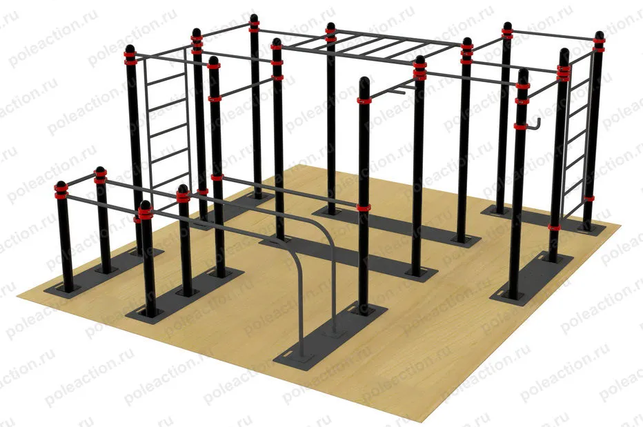 Спортивный комплекс представляет собой сборную металлическую конструкцию состоящую из семнадцати опорных столбов с площадками для крепления к пластинам основания и полусферическими заглушками, девяти перекладин длиной L=1090 мм., одной перекладины длиной L=1090 мм с возможностью выполнять упражнения «узким хватом», брусьев для отжиманий, рукохода и двух шведских стенок. Предусмотрен крюк для крепления дополнительных приспособлений, например резиновых петель. Крепление элементов спортивного комплекса осуществляется хомутами, что позволяет легко и быстро фиксировать их на нужной высоте, а опорных столбов к пластинам основания болтами с полусферической головкой. Разборная конструкция спортивного комплекса имеет высокую прочность и позволяет без особых навыков производить её монтаж и демонтаж. Все элементы покрыты атмосферостойкой порошковой краской, нанесенной методом электростатического напыления с последующим обжигом в печи.