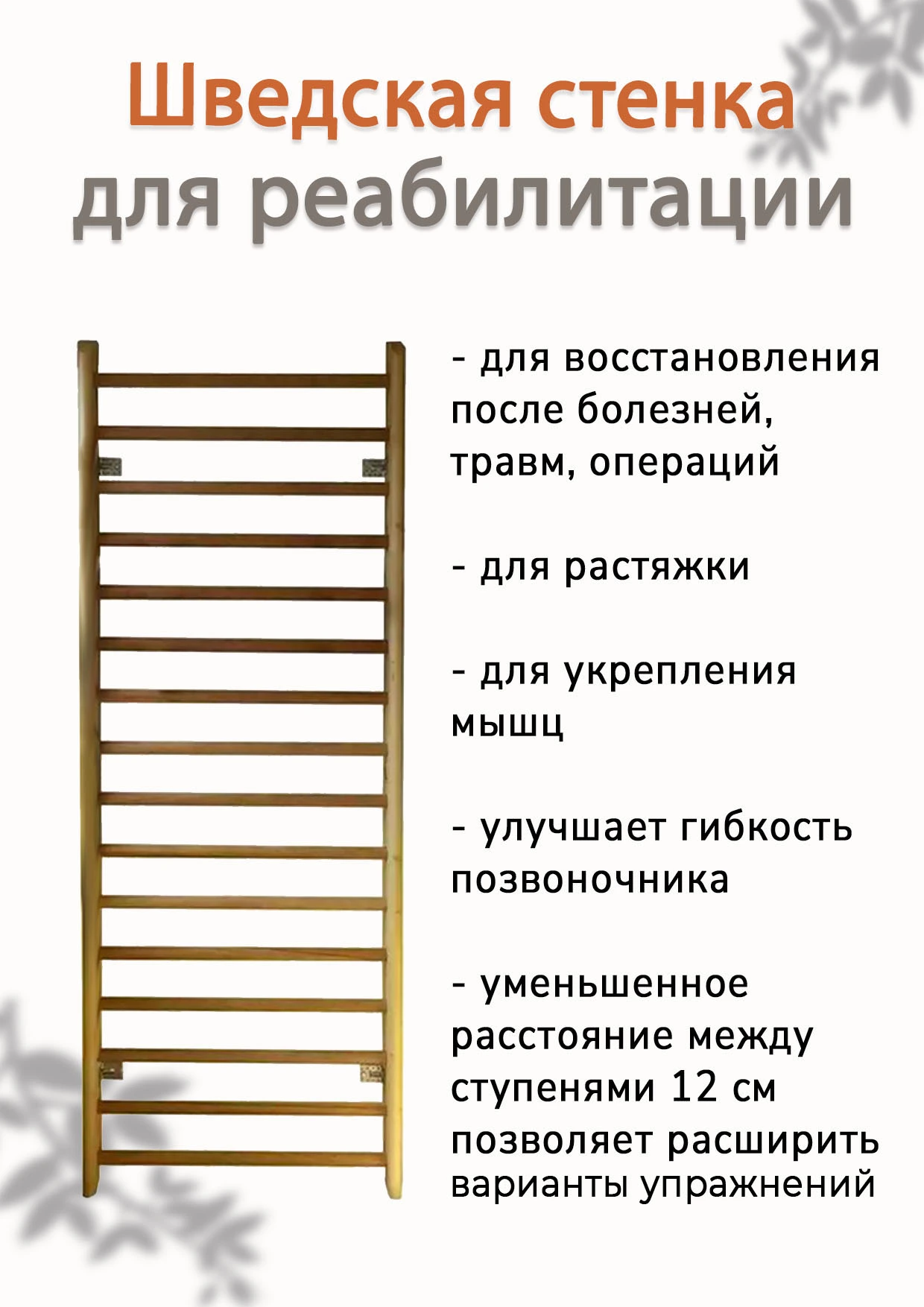 Шведская стенка подходит для реабилитации, ЛФК. Уменьшенное расстояние между ступенями позволяет расширить комплекс упражннеий. Изготовлена полностью из натурального дерева - сосна с перекладинами из березы.