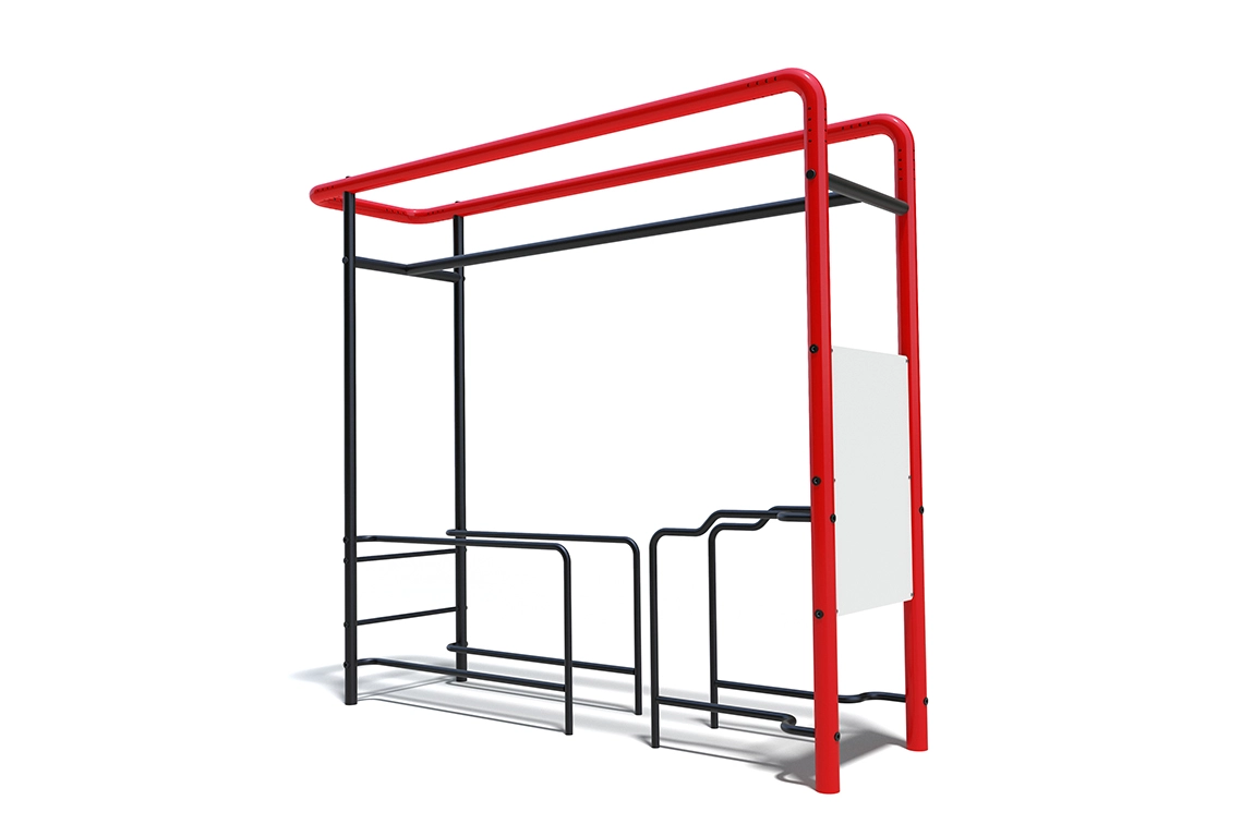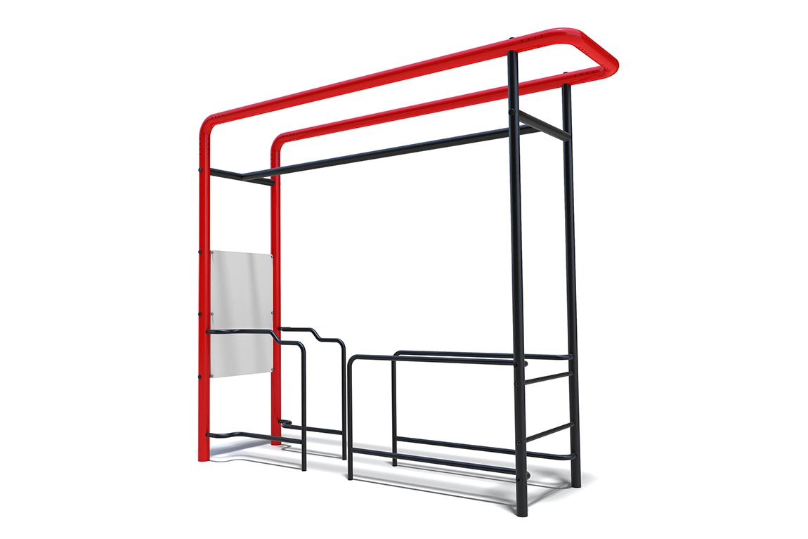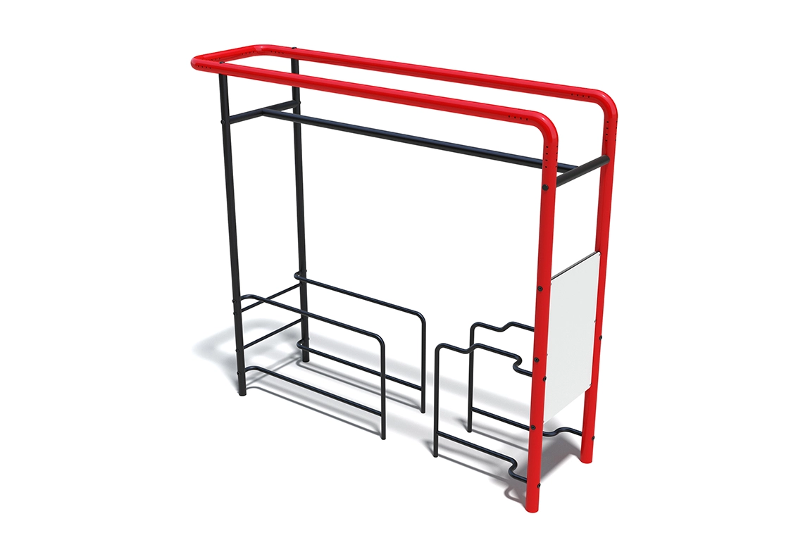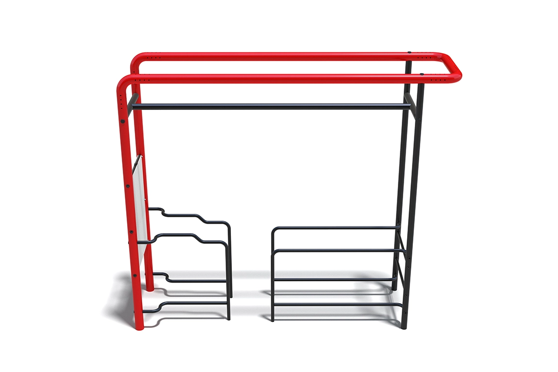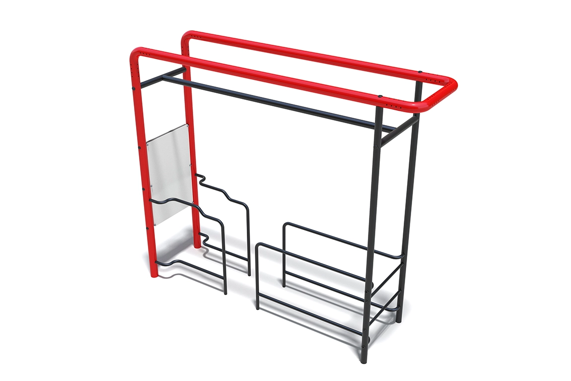 Уличный тренировочный комплекс с брусьями для отжиманий. Диаметр брусьев составляет 42 мм – это наиболее распространенный размер уличных поручней для отжиманий. В комплексе представлены несколько уровней от поверхности площадки, поэтому каждый найдет подходящую именно ему высоту.