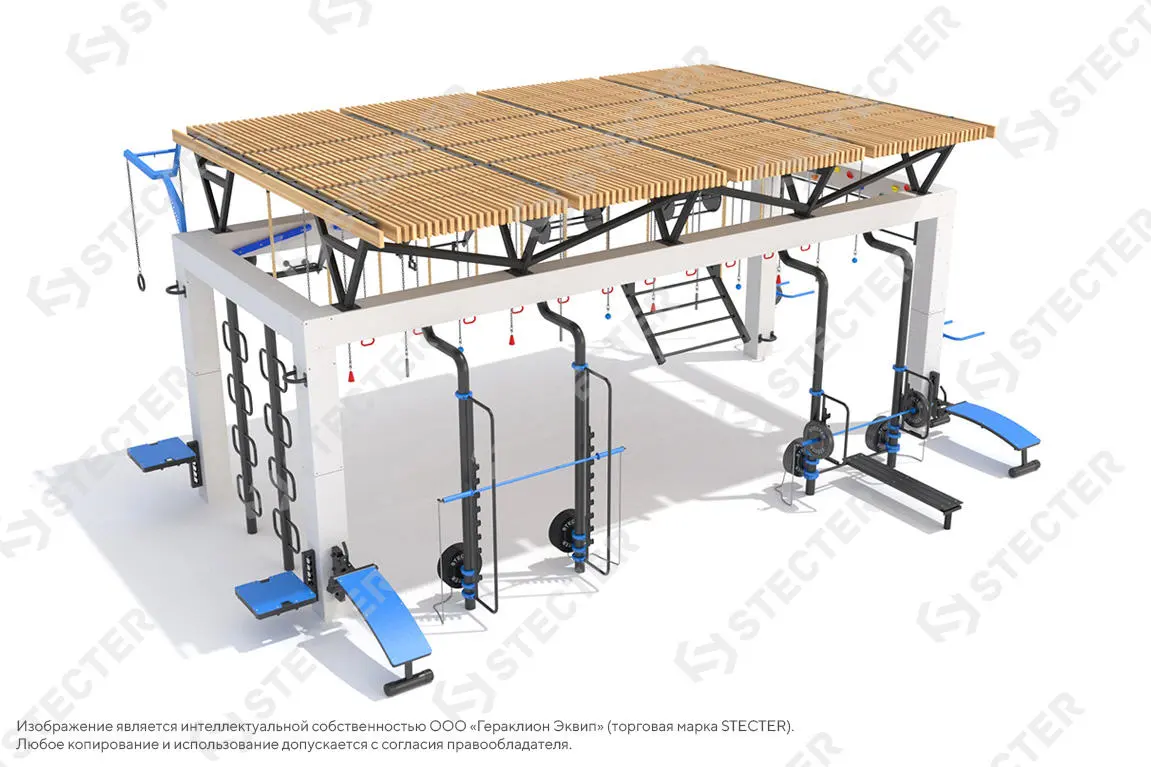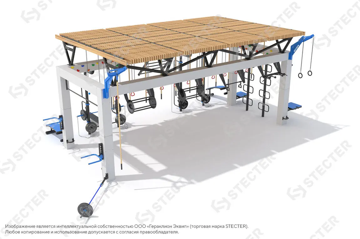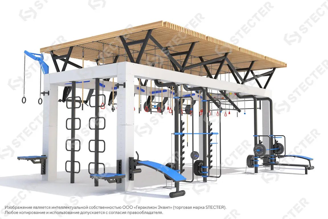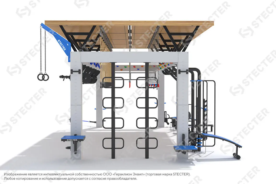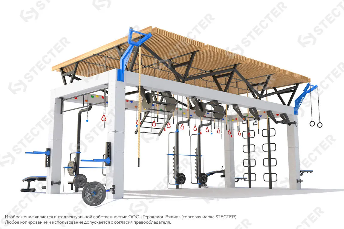 Уличный спортивный комплекс для тренировок «Центр Силы» объединяет в своем составе огромное количество снарядов из воркаута, фитнеса, калистеники, скалолазания и ниндзя спорта. Большой набор уникальных спортивных элементов позволяет дать нагрузку на все группы мышц. Мощный каркас несущей рамы имеет внушительную длину пролетов по 8 и 3 метра, что позволяет выдержать достаточную зону безопасности между соседними спортивными элементами.