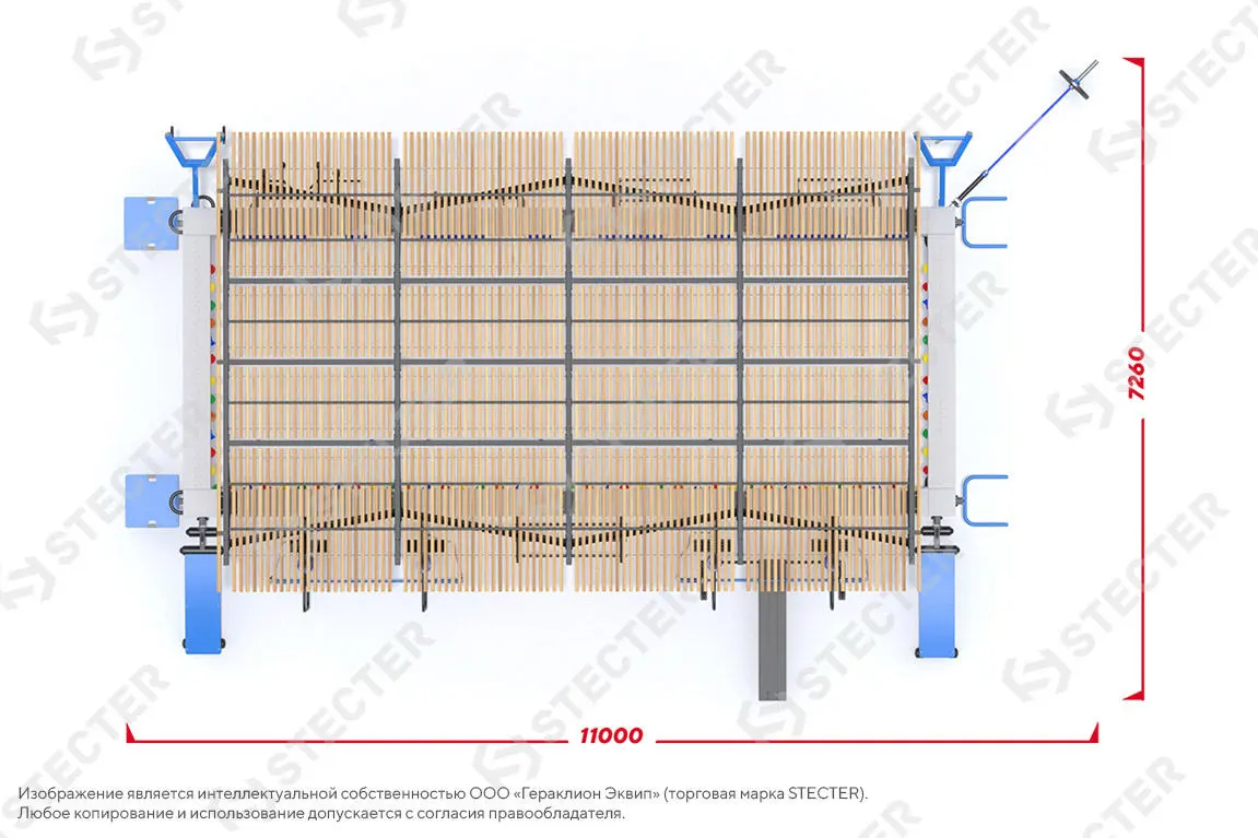 - Препятствие «Тропа альпиниста» - препятствие содержит зацепы: классические для альпинистов и планки с различными углами наклона. Все зацепы находятся по периметру внутри несущего каркаса рамы. Общая длина 1 круга препятствия составляет 22 метра. Количество - 1 шт.