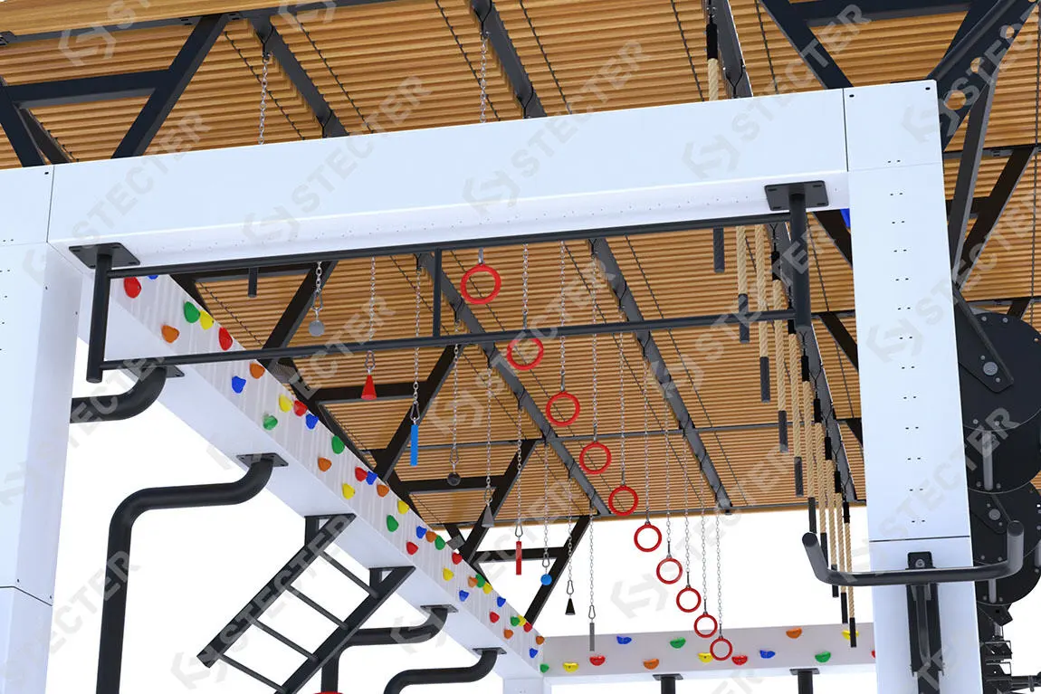 - Препятствия «Ниндзя» - включает в себя 3 «дорожки» с различными подвесными снарядами, предназначенными для развития ловкости, координации движений и силы хвата. К указанным подвесным снарядам относятся канаты, гимнастические кольца, зацепы разнообразной формы (цилиндры, конусы, шары). Количество – 3 шт.