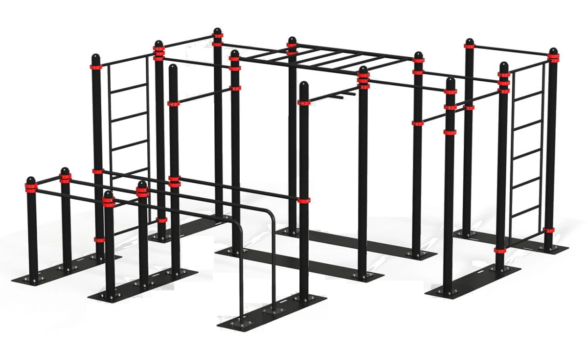 Спортивный комплекс представляет собой сборную металлическую конструкцию состоящую из семнадцати опорных столбов с площадками для крепления к пластинам основания и полусферическими заглушками, девяти перекладин длиной L=1090 мм., одной перекладины длиной L=1090 мм с возможностью выполнять упражнения «узким хватом», брусьев для отжиманий, рукохода и двух шведских стенок.